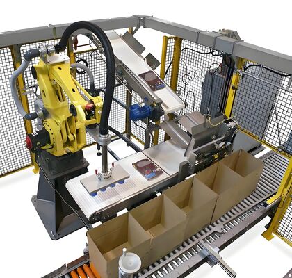 Este sistema foi projetado para a embalagem automatizada de caixas de papelão, garrafas de vinho, latas de metal e recipientes de plástico. A configuração inclui uma linha de classificação de produtos, um robô de dois eixos, uma estrutura, acessórios e um gabinete de controle principal. Ele pode ser perfeitamente integrado com eretores de caixas, seladores de caixas e paletizadores para criar uma linha de produção totalmente automatizada.